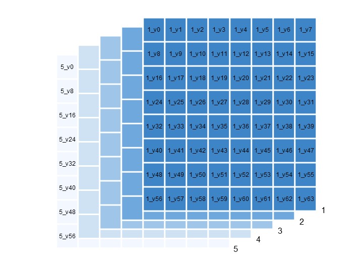 - tof_[1-5]_v[0-63] - There are five time-of-flight sensors on the watch that measure distance. In the dataset, the 0th pixel for the first time-of-flight sensor can be found with column name tof_1_v0, whereas the final pixel in the grid can be found under column tof_1_v63. This data is collected row-wise, where the first pixel could be considered in the top-left of the grid, with the second to its right, ultimately wrapping so the final value is in the bottom right (see image above). The particular time-of-flight sensor is denoted by the number at the start of the column name (e.g., 1_v0 is the first pixel for the first time-of-flight sensor while 5_v0 is the first pixel for the fifth time-of-flight sensor). If there is no sensor response (e.g., if there is no nearby object causing a signal reflection), a -1 is present in this field. Units are uncalibrated sensor values in the range 0-254. Each sensor contains 64 pixels arranged in an 8x8 grid, visualized in the figure below.